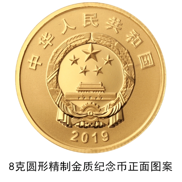 8克圓形金質紀念幣背面圖案為慶祝中華人民共和國成立70周年活動標識,并刊“中華人民共和國成立70周年”字樣及面額。